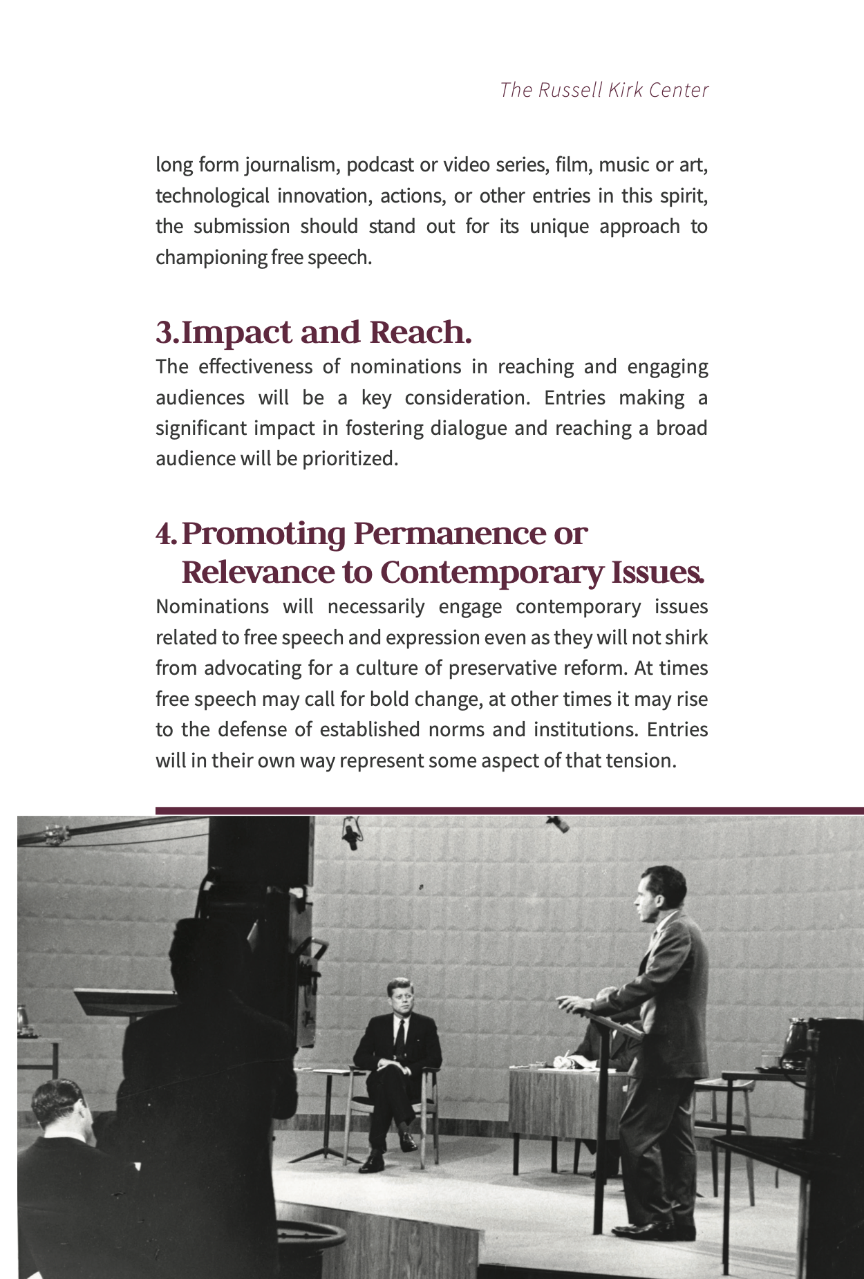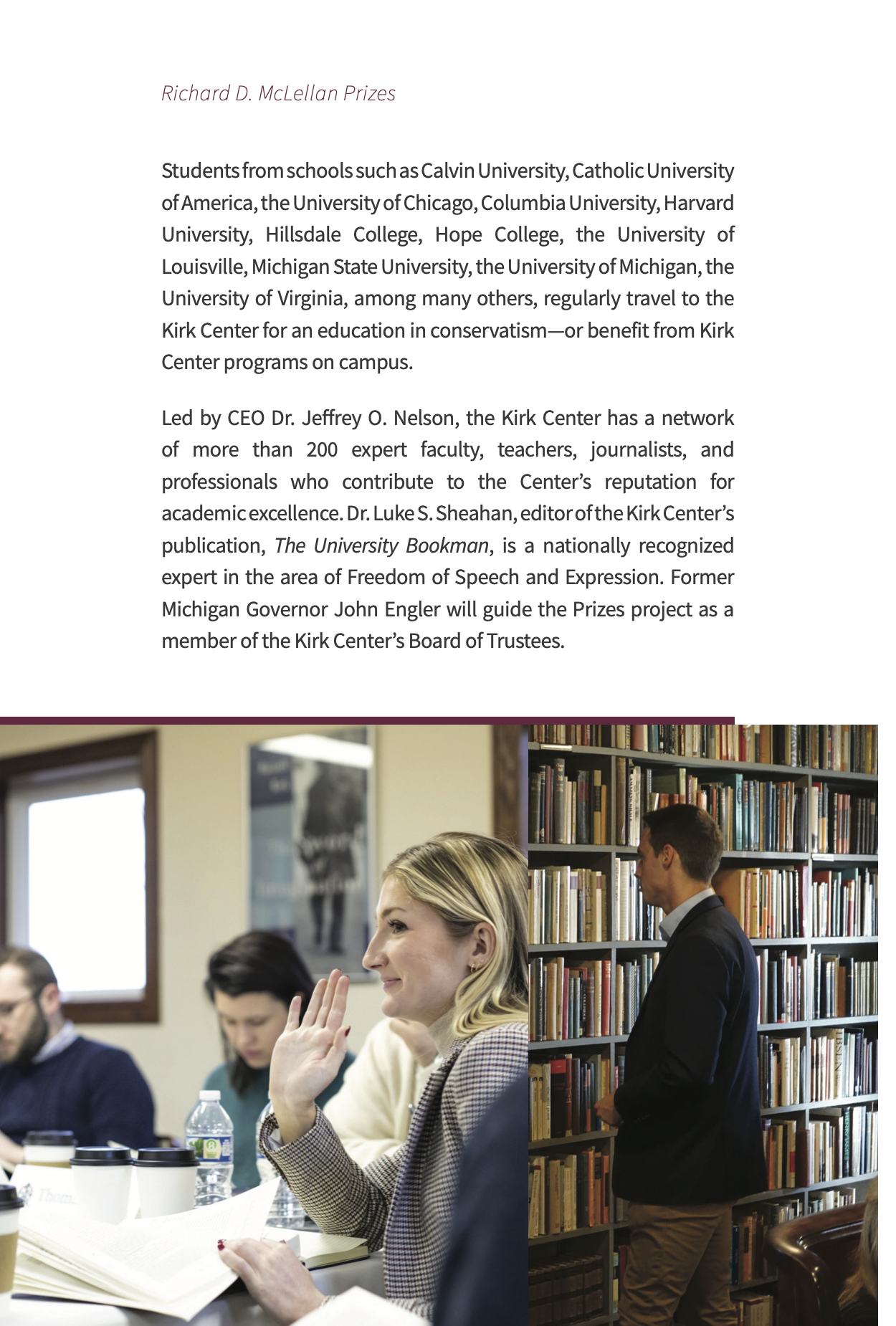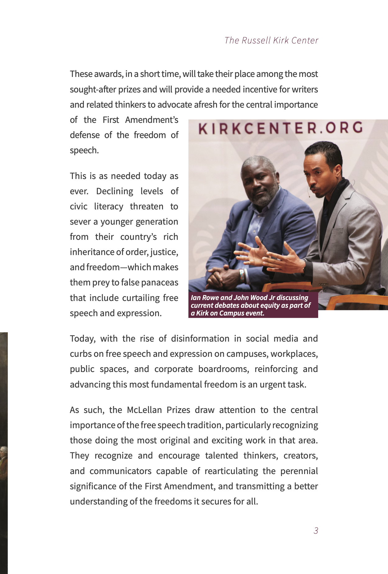 The Richard D. McLellan Prizes is a unique educational program administered by the Russell Kirk Center. Its aim is to help reshape the national conversation on issues surrounding the durability and prospects for the American tradition of free speech and expression as guaranteed in the U. S. Constitution’s First Amendment.