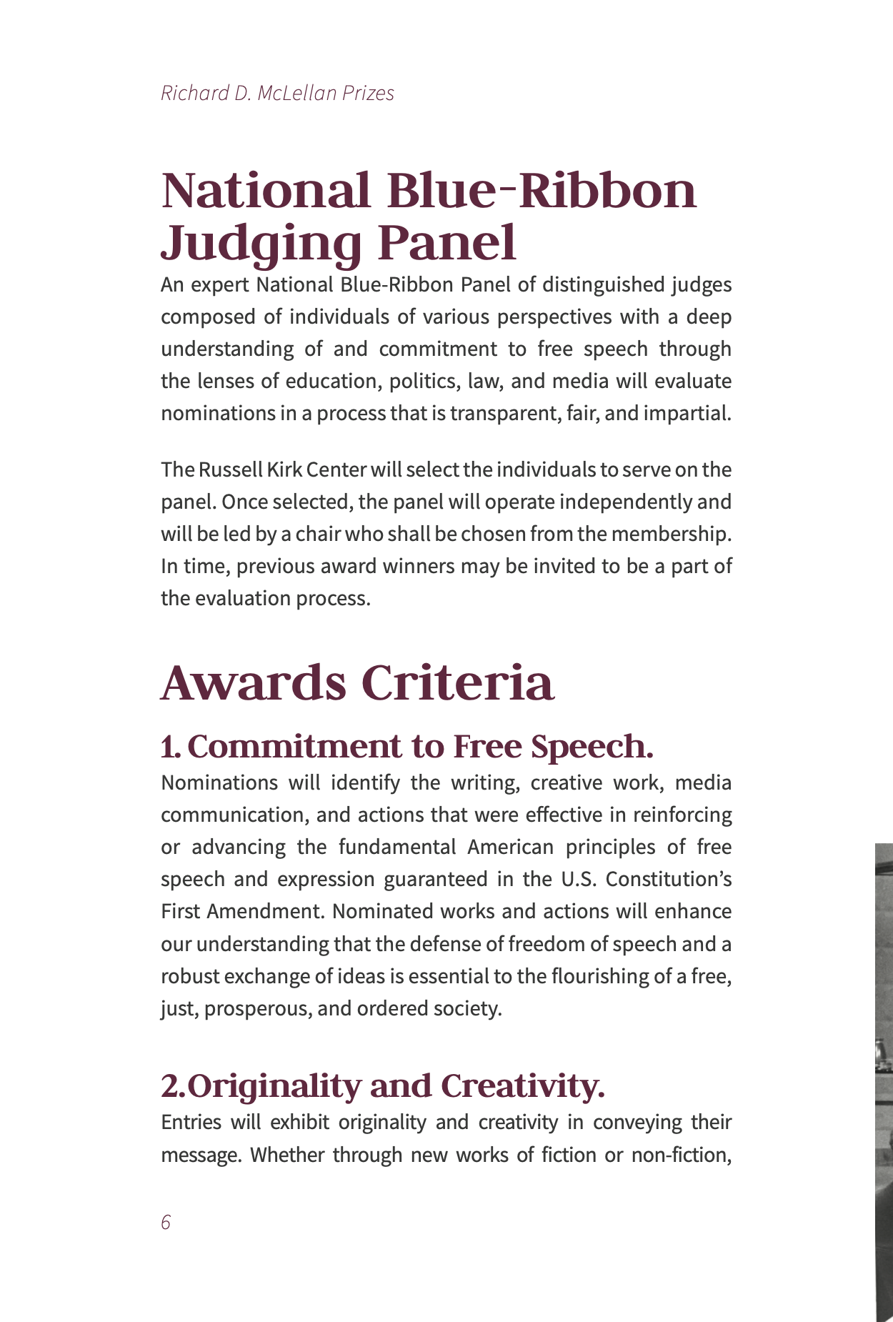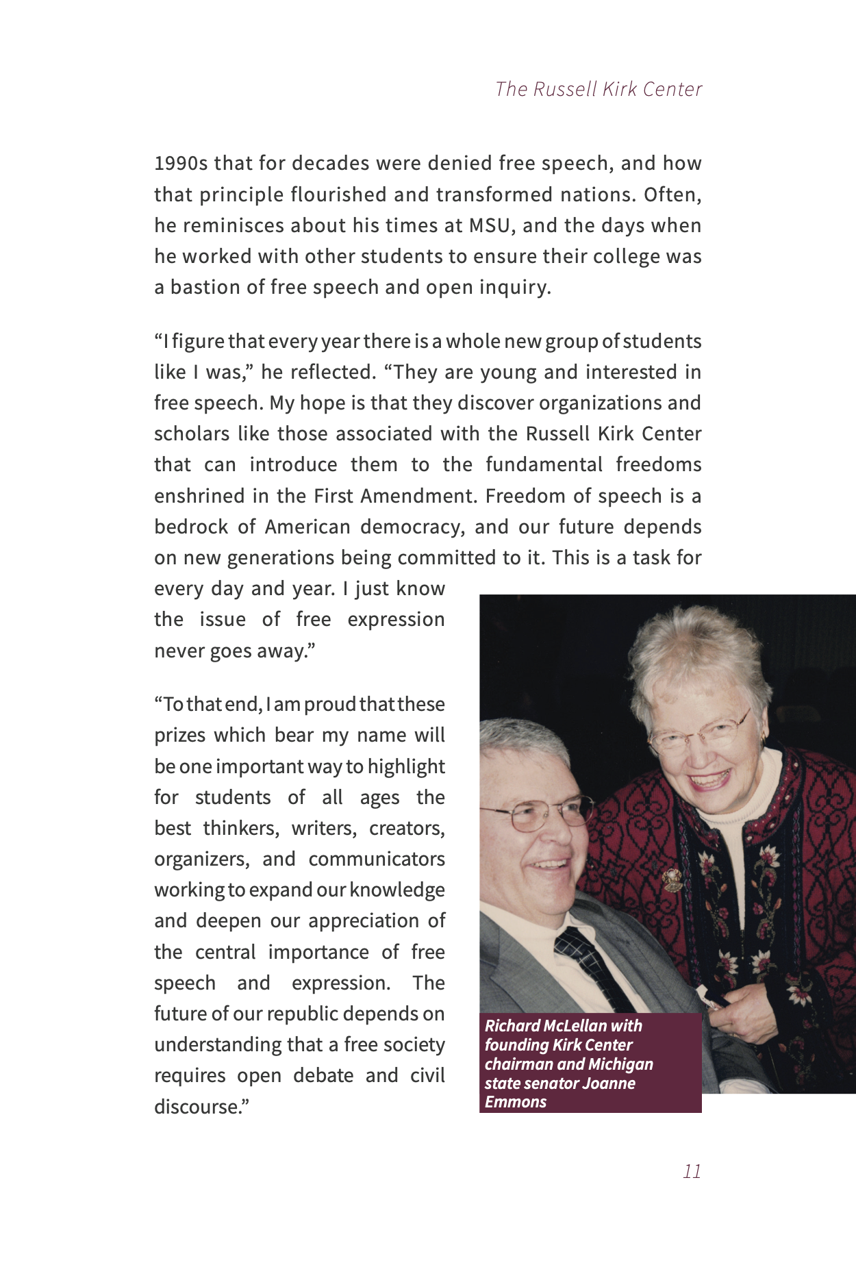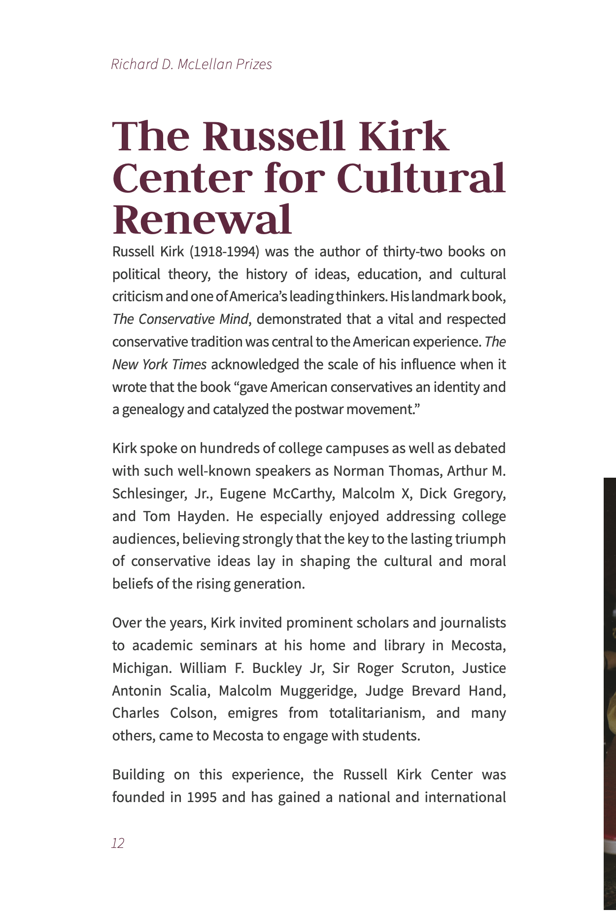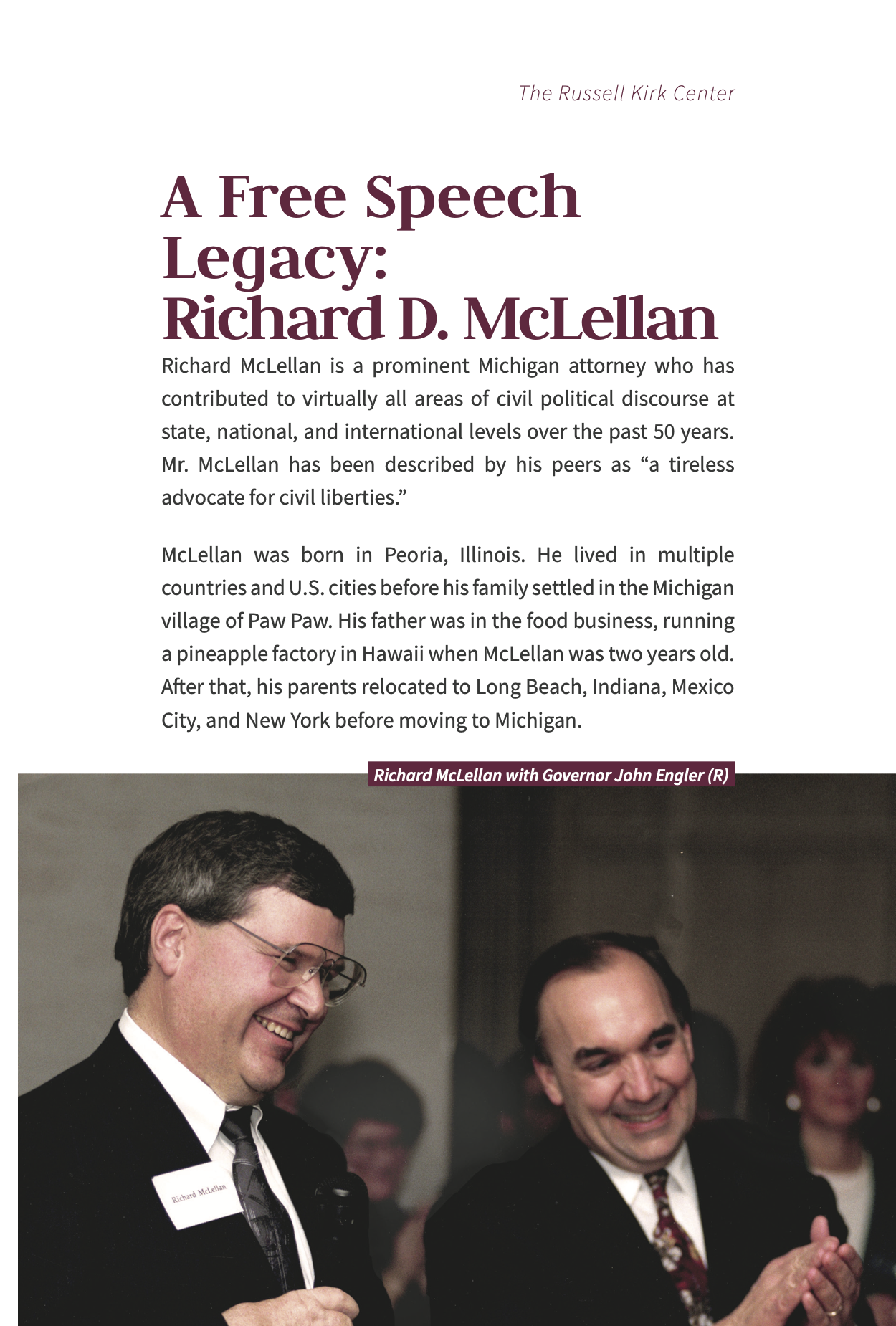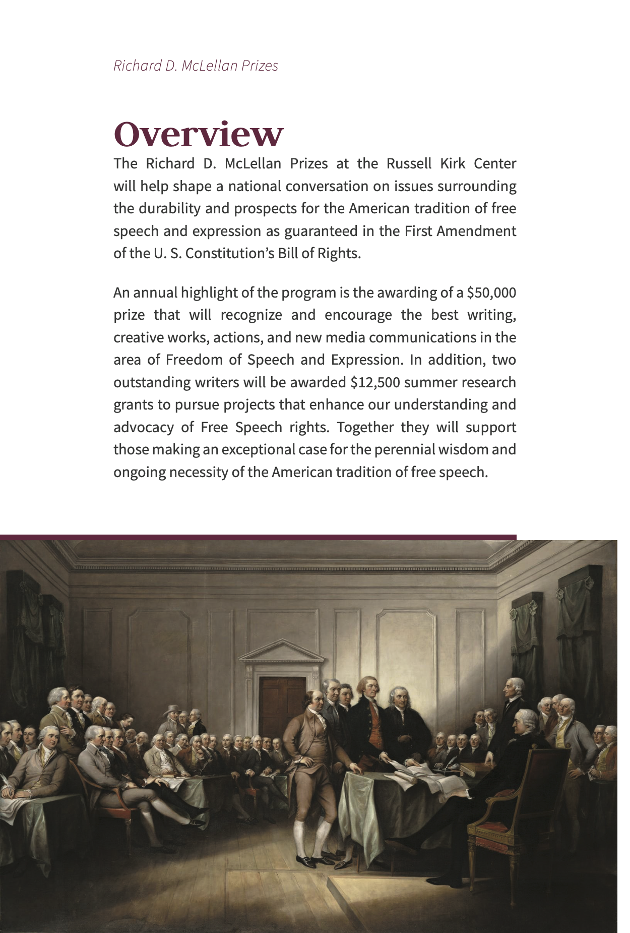 The Richard D. McLellan Prizes is a unique educational program administered by the Russell Kirk Center. Its aim is to help reshape the national conversation on issues surrounding the durability and prospects for the American tradition of free speech and expression as guaranteed in the U. S. Constitution’s First Amendment.